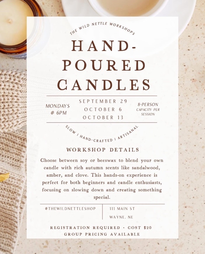 Monday, Sept 29 @ 6pm / Monday, Oct 6 @ 6pm / Monday, Oct 13 @ 6pm Choose between soy or beeswax to blend your own candle with rich autumn scents like sandalwood, amber, and clove. This hands-on experience is perfect for both beginners and candle enthusiasts, focusing on slowing down and creating something special. Cost: $20 Sign up through the link to save your spot! https://gforms.app/TjDV38sImages